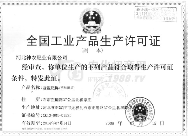 河北神農(nóng)肥業(yè)有限公司是國(guó)家質(zhì)檢檢驗(yàn)、檢疫總局首批發(fā)放《生產(chǎn)許可證》的大型企業(yè)之一。我公司是集農(nóng)業(yè)開發(fā)、新產(chǎn)品研制和生產(chǎn)推廣為一體企業(yè),主要產(chǎn)品有《神農(nóng)豐田》牌25%、30%、40%、50%、57%復(fù)合肥。高、中低檔沖施肥(粉劑、液體、膏體、膠體)和鉀肥系列(二銨、腐蝕酸型硫酸鉀、二銨伴侶)及磷酸二氫鉀等80多種產(chǎn)品。我公司以質(zhì)量說話,以信譽(yù)樹人,以高度的社會(huì)責(zé)任感致力于農(nóng)業(yè)產(chǎn)品的開發(fā)及應(yīng)用。本著服務(wù)三農(nóng),發(fā)揚(yáng)“以科學(xué)求發(fā)展以質(zhì)量求生存”的企業(yè)精神,靠過硬的質(zhì)量立足于競(jìng)爭(zhēng)中的不敗之地!