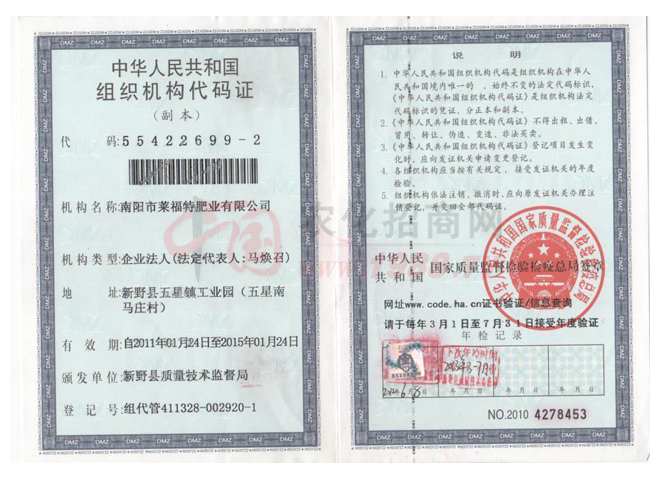 證書(shū)名稱(chēng):組織機(jī)構(gòu)代碼證 發(fā)證機(jī)構(gòu):新野縣質(zhì)量技術(shù)監(jiān)督局